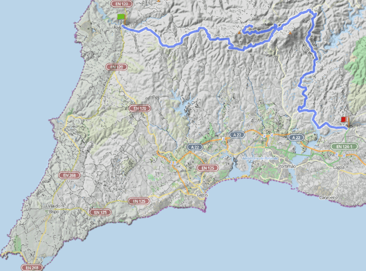 Exzellent geebnet und autofreie Straßen im Gebirge von Monchique. Starten Sie das Radfahren an der Algarve, indem sie von Aljezur in Richtung „Marmelete“ fahren, einem fordernden 20km Aufstieg auf wunderschönen Straßen. Genießen Sie die leichte Abfahrt und die abschüssigen Hügel in Monchique und nehmen Sie dann den Fóia in Angriff, den hõchsten Berg der Algarve mit 900 Metern – 8km geht es rauf, bis man oben ankommt. Lassen Sie den Blick über diese wunderschöne Aussicht schweifen und fahren dann zurück bergab nach Monchique, indem sie nach Alferce trampeln und dann eine Nebenstraße in Richtung „ribeira de Oldelouca“ nehmen und dann sich dann links halten bis nah Silves, wo sie die Burg und die wichtigste, historischste Stadt in der Region anschauen. 90km Fahrt. Kontaktieren Sie uns hier, um die Route zu downloaden.